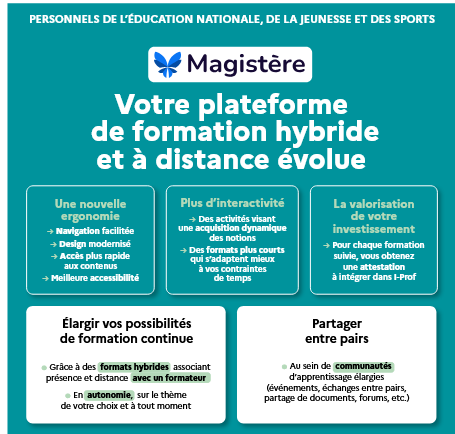 La plateforme de formation Magistère propose des formations hybrides accompagnées en territoire. Elle propose aussi des formations à distance, accessibles en auto-formation ou avec accompagnement, destinées à l’ensemble des personnels de l’éducation.
